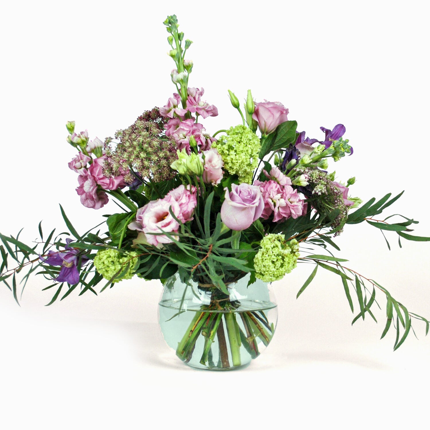 This combination of stocks and silver eucalyptus, accompanied by the bright and colourful clematis, lisianthus, viburnum, create an unmatched floral fragrance to fill the home. Within the arrangement are the classic roses, effectively topping off the final ingredient to this floral concoction and creating a luxurious look. The bouquet is presented in a globe-shaped spherical vase made of glass.